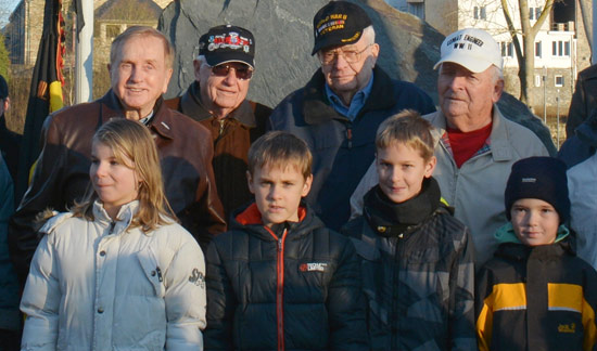 (Douze vétérans américains étaient présents à Vielsalm le 14 décembre 2014. Un diplôme de citoyen d'honneur leur a été remis par le bourgmestre Elie Deblire, l'échevine Nele De Corte et des enfants de l'école communale de Salmchâteau qui figurent sur la photo avec quelques vétérans)
