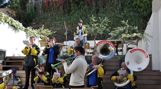 (Une journée du client animée par des musiciens du Brass-Band, ici, sur la très belle terrasse de la boulangerie-pâtisserie "Au Vieux Marché")