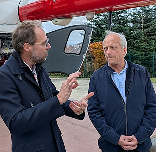 (Le ministre Yves Coppieters a souhaité voir notre hélico de près et a pu profiter des explications techniques fournies par le médecin spécialiste Romain Betz, directeur médical du CMH)