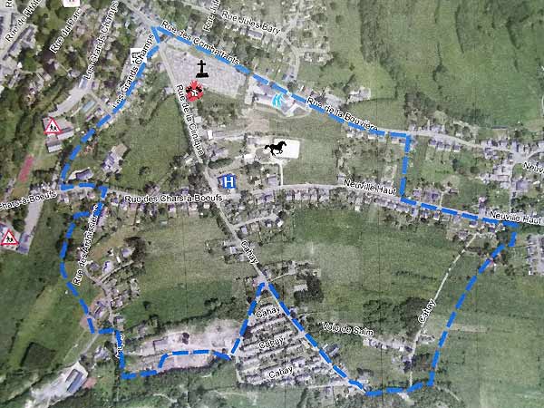 (Bureau d'études Impact. La zone retenue est contenue dans un périmètre bordé par le quartier de Cahay, la rue des Ardoisières, la rue Les-Grands-Champs, la rue des Combattants, la rue de la Bouvière, Neuville-Haut et retour vers Cahay)