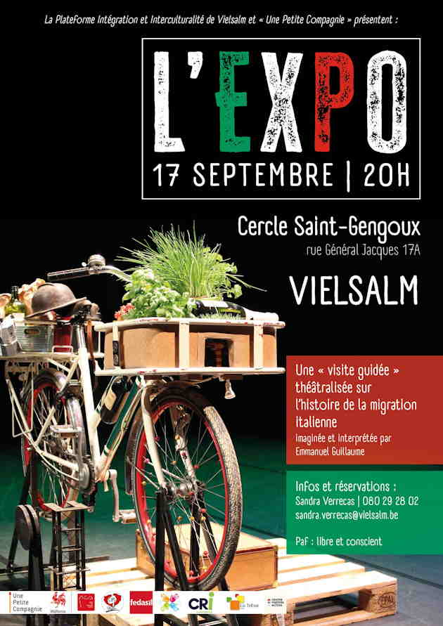 Une soirée de théâtre-action (L’Expo) sur l’immigration italienne : une plongée dans l’histoire, miroir tendu à notre actualité, un spectacle engagé, humain et vibrant proposé par la compagnie de théâtre-action " Une Petite Compagnie " (https://www.facebook.com/unepetitecompagnie).