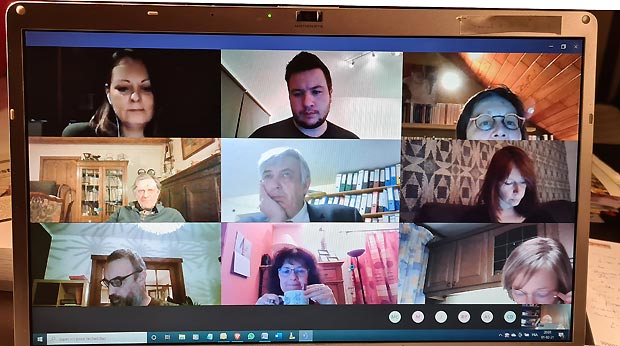 (5' avant le début de la séance, on se prépare... Sybille Maka, Thibault Willem, Dominique Fabry qui ajuste son écran, François Rion, le bourgmestre un rien pensif, Anne Klein, Philippe Herman, la directrice générale Anne-Catherine Paquay et Stéphanie Heyden)